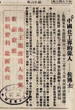 1943年,侯德榜荣膺英国化工学会名誉会员,这是当时全世界仅有的12位名誉会员之一。范旭东在庆祝会上说:这在中国化工史上,应该是最光荣的一个节目